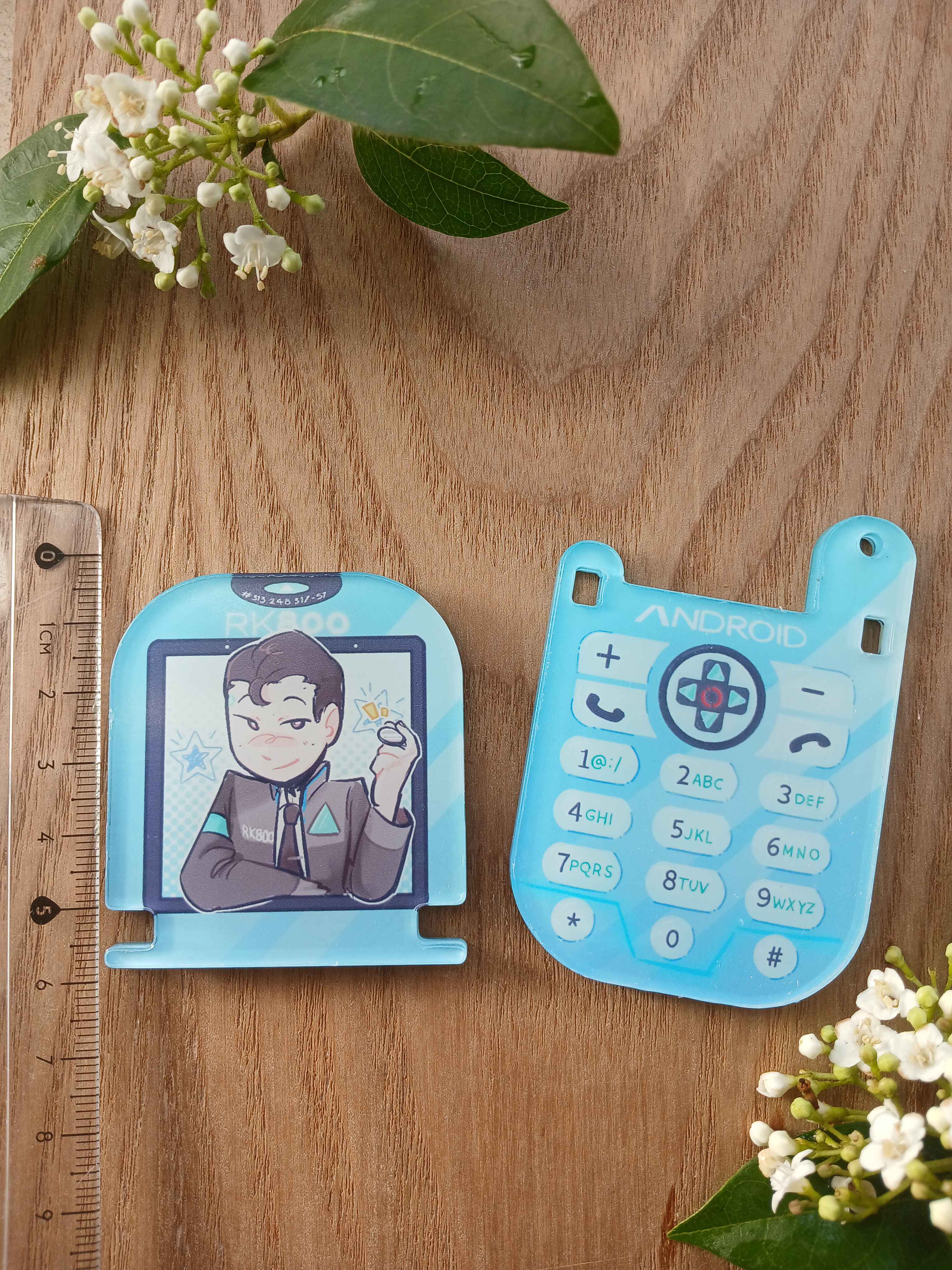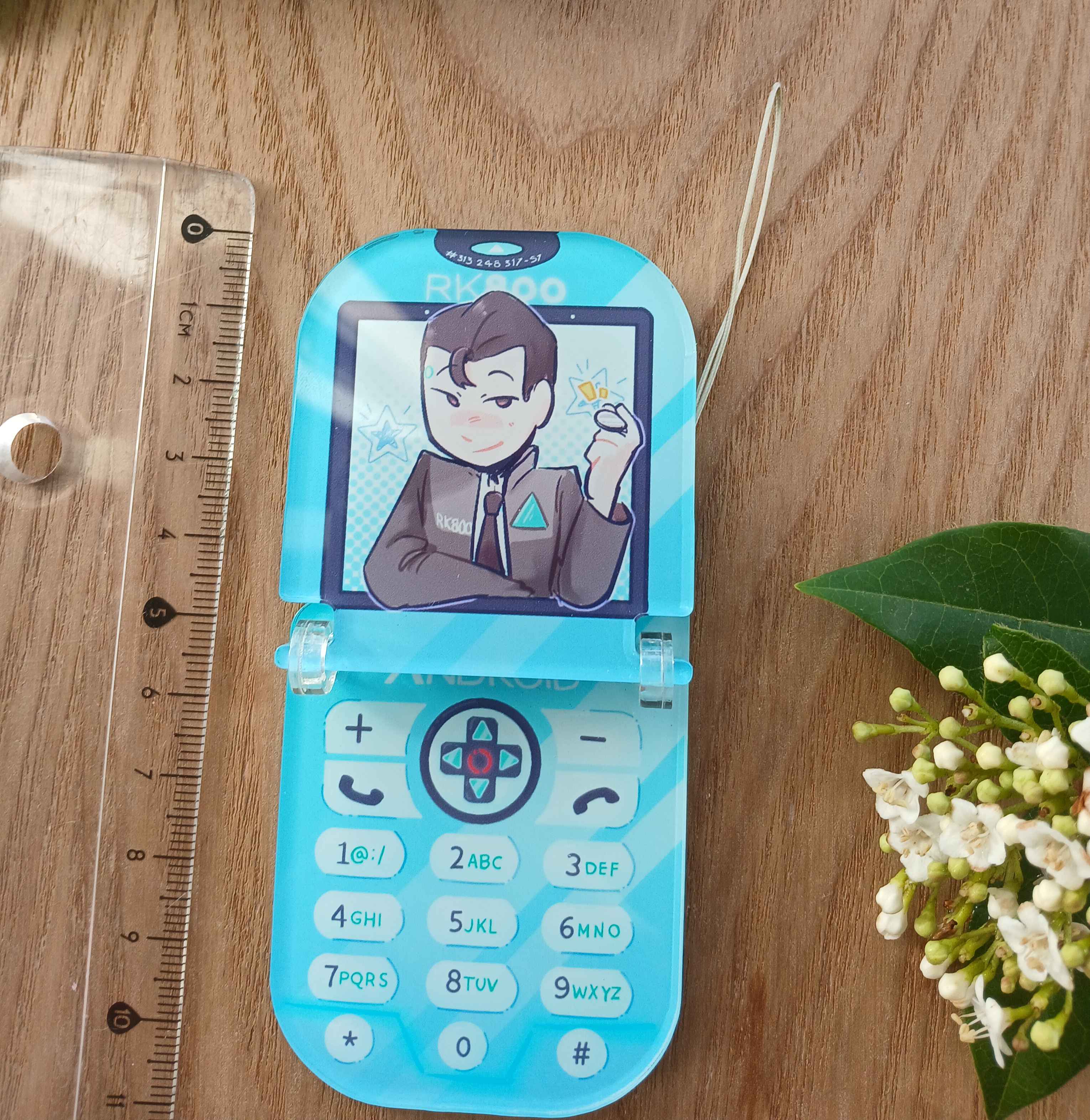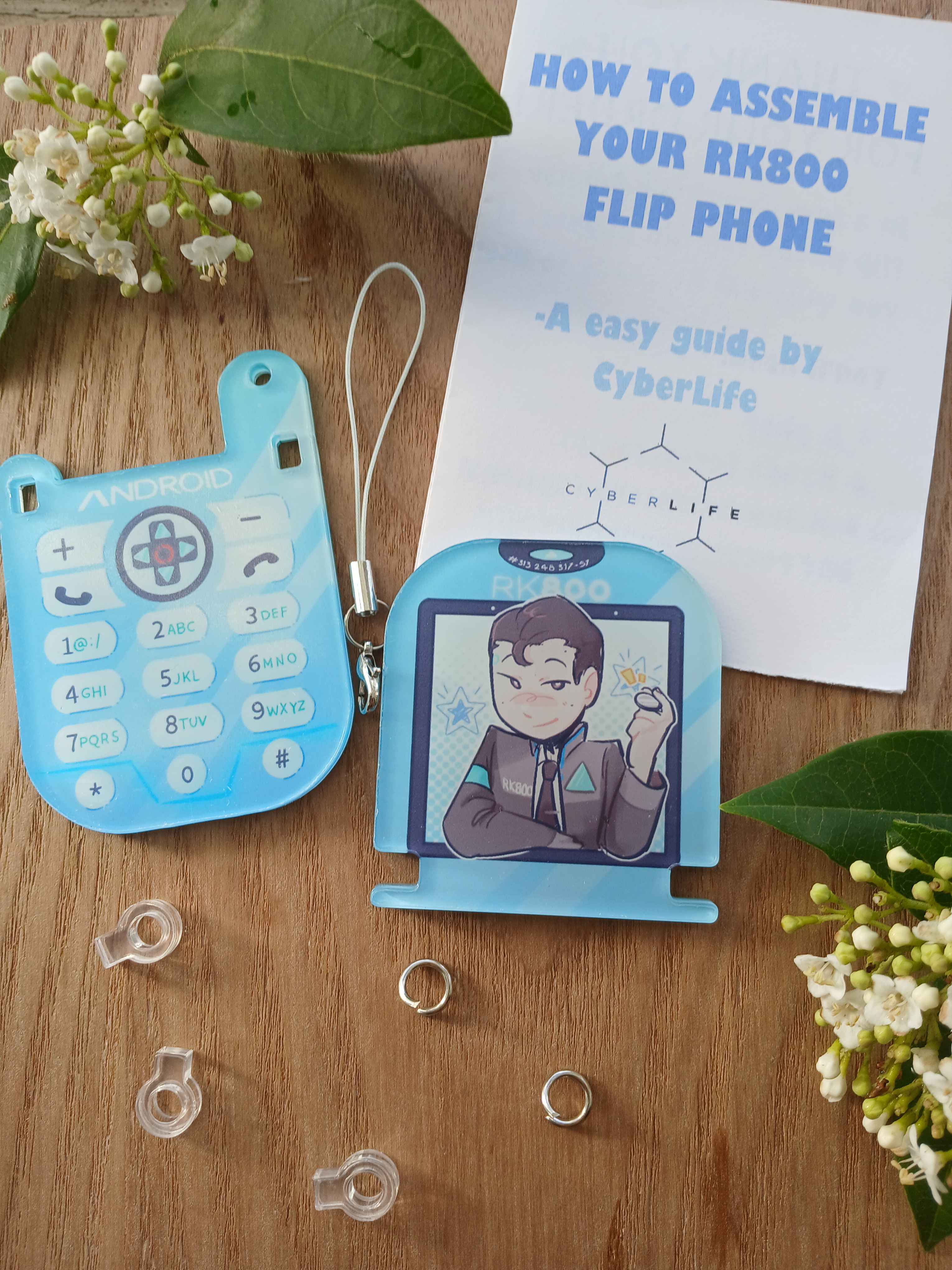 Acrylic flip phone keychain of Connor (Detroit: Become Human). 5.5cm of height on each individual part. To prevent damage on shipping the pieces come separately
